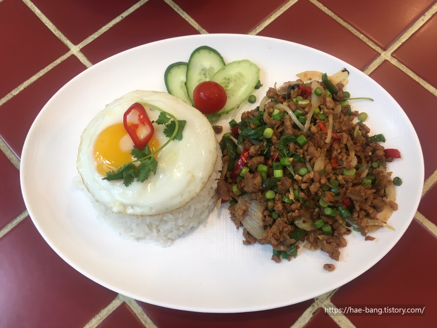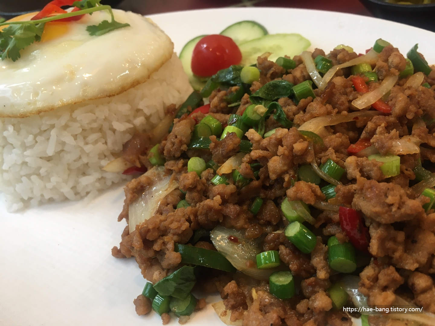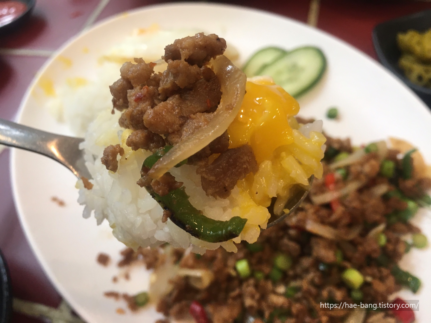 노른자를 터뜨려 밥을 한술 떠서 그 위에 팟카파오무쌉을 살포시 올려서 앙~